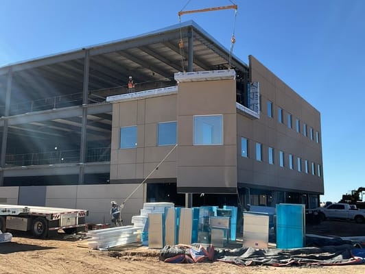 The Meridian Medical Office Building, a 95,000-square-foot multi-specialty and comprehensive cancer care facility, features cold-formed steel (CFS) non-load-bearing wall panels designed to enhance construction efficiency and safety. The structural design includes a concrete-over-metal deck with a steel-braced frame and 30,000 square feet of prefinished X-series wall panels.