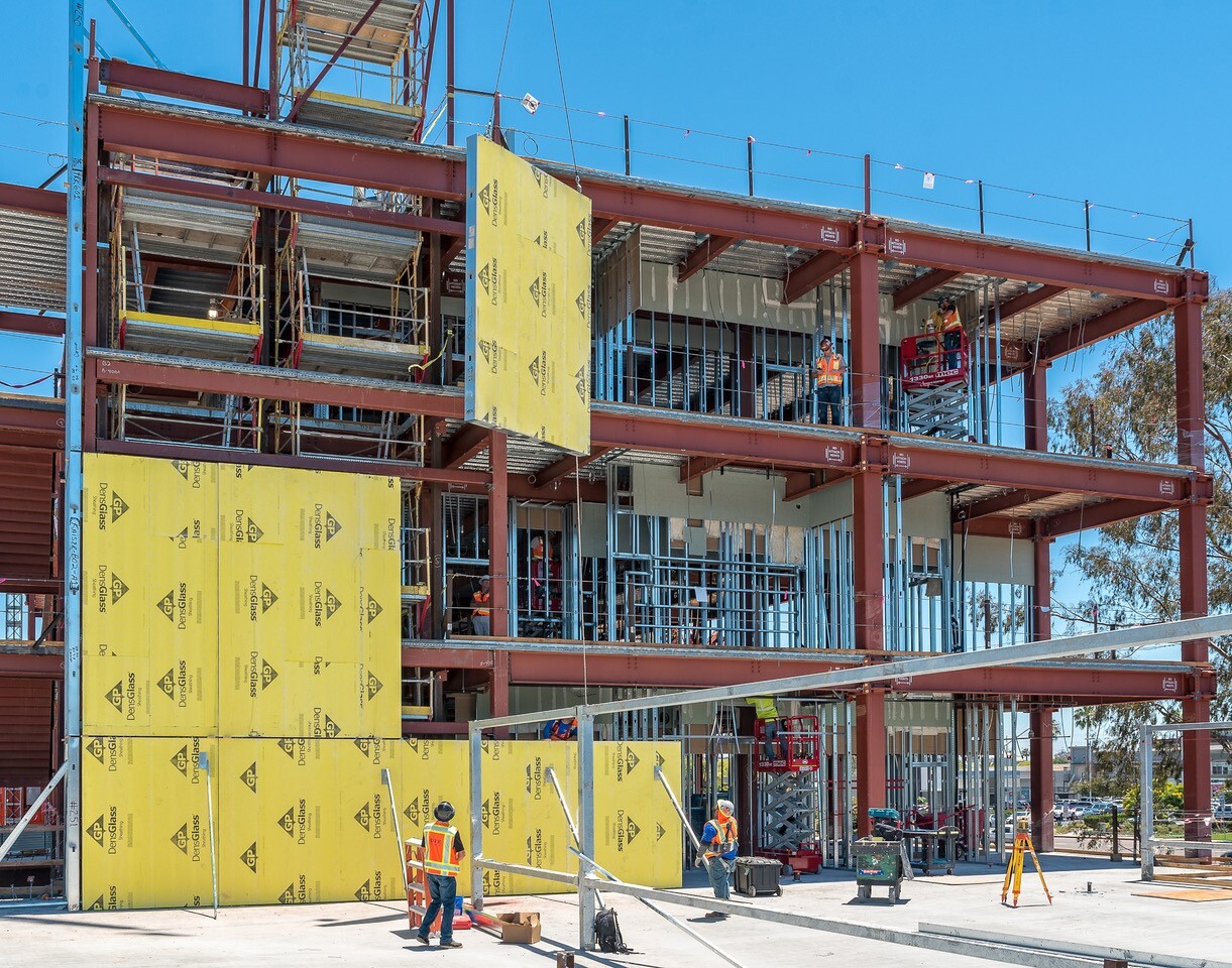DBC prefabricated and installed nearly all the exterior and interior walls for Kaiser Permanente’s Clairemont Mesa Medical Offices, a four-story, 90,000-sq.-ft. center that replaced the previously demolished facility on the same lot. The low-rise wing houses a large pharmacy, medical labs, optometry offices, two radiation suites, a café, a retail store, and a conference center. The attached tower features 101 examination rooms and 72 healthcare provider offices. The medical offices feature a mindful ambiance, with amenities such as an indoor public square with a garden, an outdoor amphitheater, exercise stations, and landscaped open space.